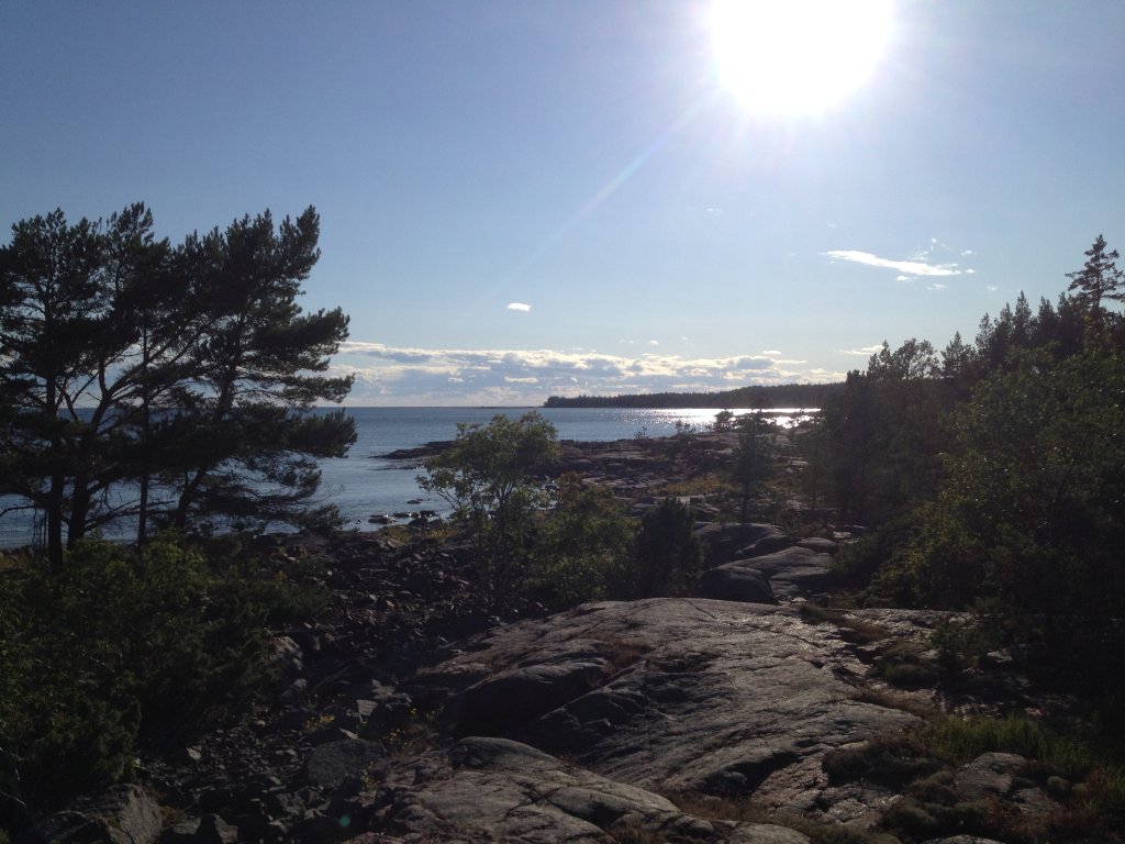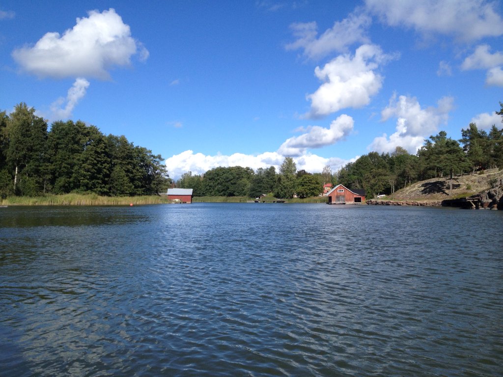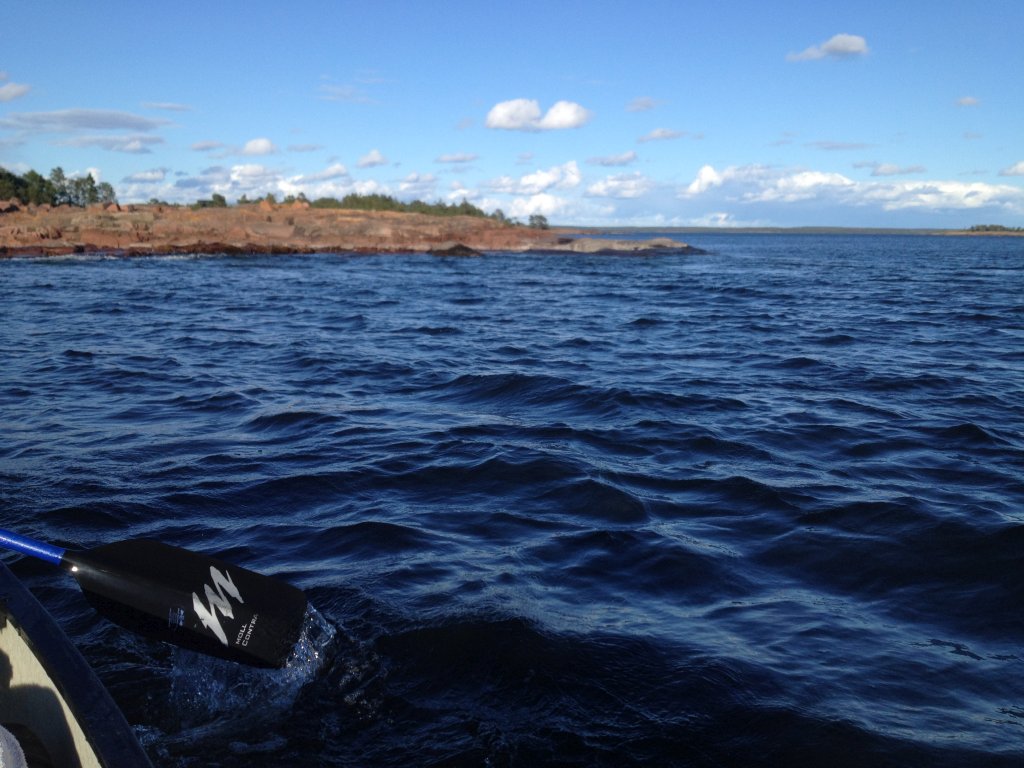 Wind und Strömung werden stärker, gerade in Ufernähe spürt man die Brandung. Wir wollen aber nicht zu weit auf den Fjord raus, unser Gepäck und unsere Vorräte (Wasser und Kekse) ist schließlich nur für ein „Tagesausflug“, nicht für eine Notlandung mit Übernachtung in der Wildnis ausgelegt. Wir paddeln bei immer schöner werdendem Wetter (wäremer, aber windiger) weiter Richtung Süden und passieren zunächst Sandhamn auf der Ostseite des Fjordes und kommen weiter voran nach Hummelvik. Der Böleviken geht langsam in den Kyrksundet über, warum der wohl so heißt, eine Kirche können wir nicht sehen und da sich das Land hebt kann hier auch keine in den Fluten liegen, spekulieren wir. Da wir uns aber weitestgehend am Westufer orientieren durchfahren wir alsbald auch den Holmviken, passieren Långnäsgrundet westlich und steuern an Holmskatan und Kalvskatan vorbei nach Korgen wo der Kyrksundet in den Torp Sund übergeht.