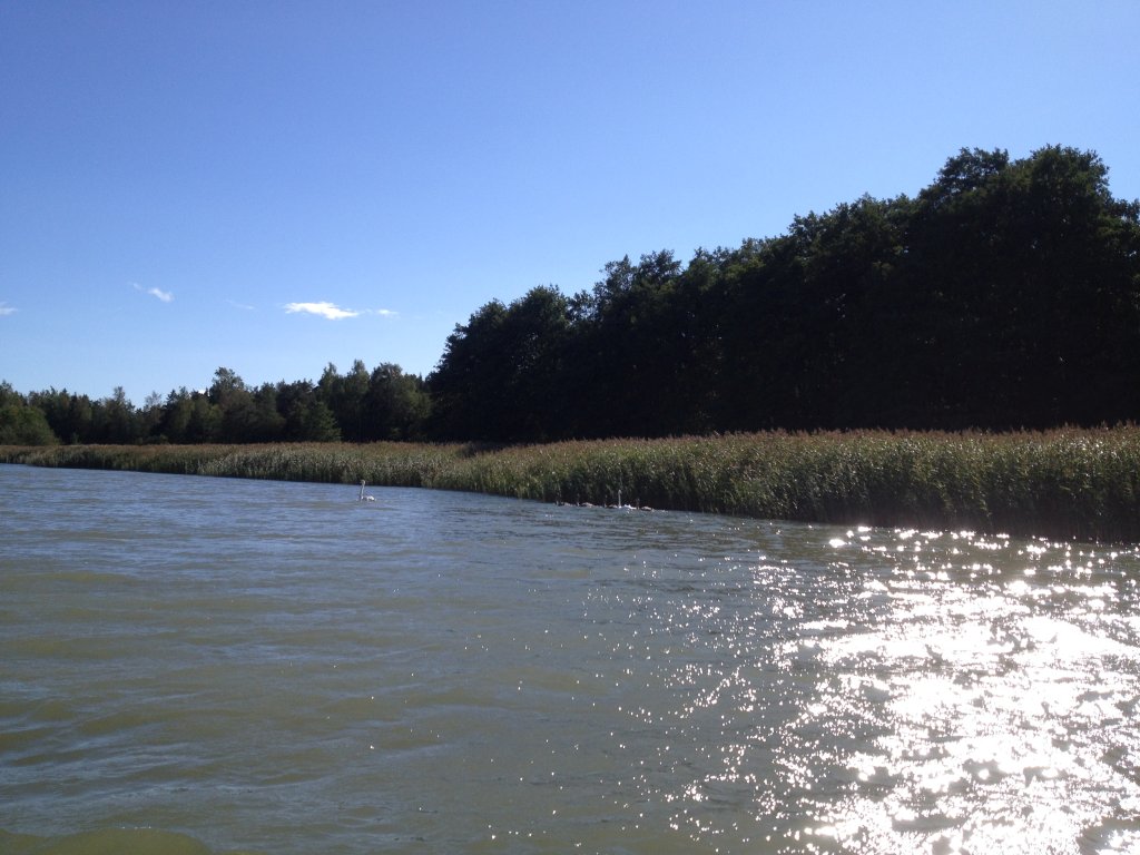 Während wir so Gedanken versunken vor uns hinpaddeln und fachsimpeln und rechnen, merken wir gar nicht wie wir dem Westufer des Böleviken bei Holmen immer näher kommen. Das Ufer ist komplett mit Schilf bewuchert und plötzlich begenet uns ein ziemlich agressiver Schwan. Während wir noch so denken „was hat der denn?“ sehen wir auch gleich den Grund für seine Agression. Scheinbar will er nur seine Familie schützen, die kurze Zeit später aus dem Schilf auftaucht. Wir verstehen, und entfernen uns sofort kleinlaut vom Ufer und gehen auf Abstand. Der Schwan begleitet uns noch eine ganze Weile und ist ziemlich laut, wir behalten ihn im Blick und irgendwann dreht er zum Glück ab.