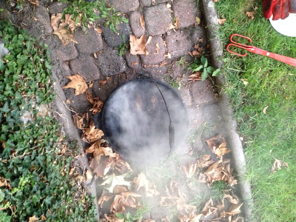 Da wir aber sowieso auf Einbrennen eingestellt waren – halb so wild. Also rasch etwas Feuer in der Feuerschale gemacht und rauf mit dem Ofen. Zunächst wird der Ofen etwas heiß gemacht und dann im heißen Zustand mit Öl eingerieben. Wir haben uns für Rapsöl entschieden, da es höheren Temperaturen besser wiederstehen kann. Das Einbrennen des Fetts hat zum Ziel dem gusseisernen Topf eine Art Patina aufzubrennen, die ihn vor Rost schützen soll und eine Art natürliche Beschichtung darstellt, die ein Anbrennen von Speisen vermeiden soll – ganz so wie bei modernen beschichteten Töpfen und Pfannen. Im Netz hatte ich auch einen Hinweis gefunden, dass man den Topf mit einer Schweineschwarte einreiben soll – leider hatten wir keine und daher mussste das Speiseöl herhalten.