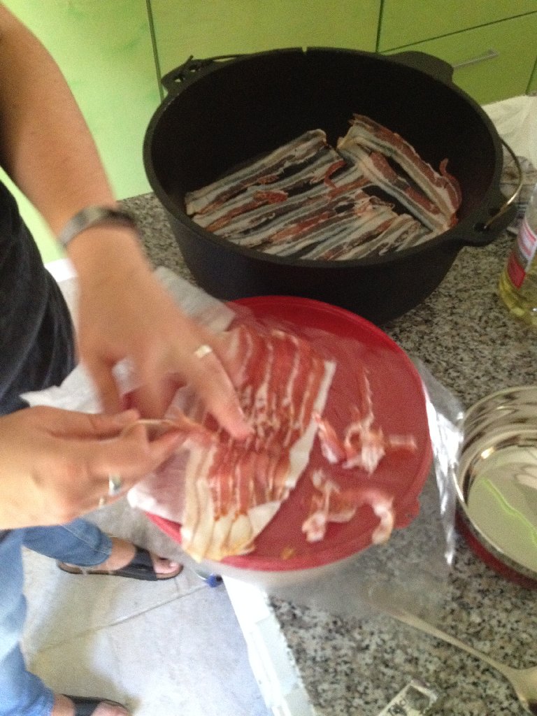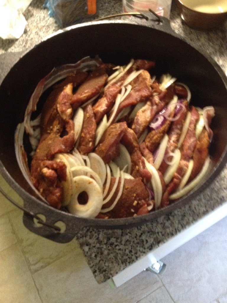 Auf slowcooker.de fanden wir genau das Rezept wonach wir gesucht haben, „Männeressen: Schichtfleisch aus dem Dutch Oven„. Das klang gut: 3 Kilo Nacken mit ein paar Zwiebeln dazwischen. Wow. Eine detaillierte Einkaufsliste und eine bebilderte Zubereitungsanleitung ist auf slowcooker.de zu finden.