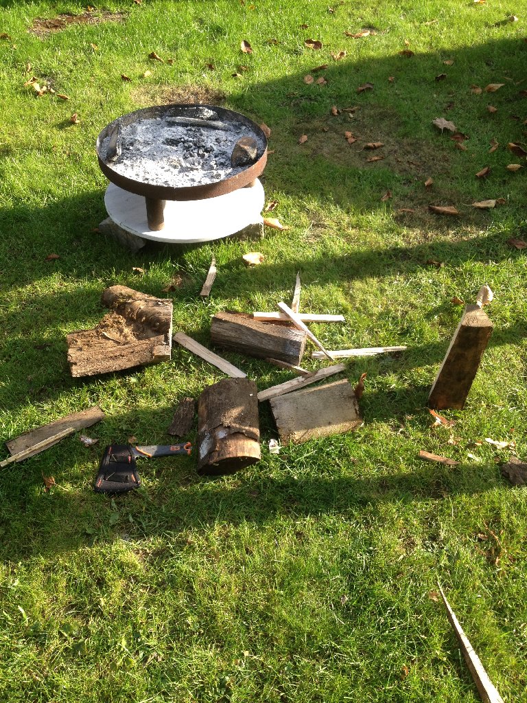 Für das Feuer hatte wir diesmal zwei Feuerschalen vorbereitet, eine für den Dutch Oven zur Zubereitung und eine für die Produktion für Holzkohle. In die Feuerschlae für den Dutch Oven sollten diesmal nur vollständig runtergebrannte Scheite, die nur noch glühen, nicht brennen. So der Plan!