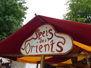 In der zweiten Runde – der Markt ist nämlich rund um die Burg angelegt – ist uns dann auch die thematische Aufteilung des Marktes aufgefallen, der Markt war gegliedert in „bei Hofe“, „bei den Rittern“, „bei den Rittern“, „bei den Orientalen“ und „bei den Bauern“. Bei den Orientalen kam uns ein Sultan in schicker Badekluft entgegen und dort ließen wir uns auch Waffeln und den süße Erdnuss- Baklava- Gebäck schmecken.