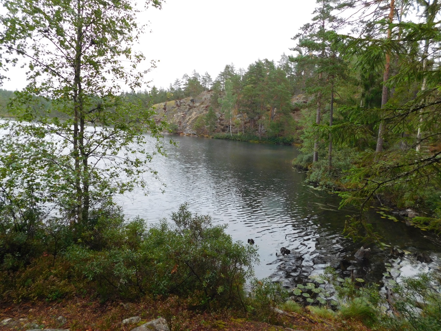 Nachdem wir also das Highlight der Strecke besucht hatten, traten wir den Heimweg an. Wie schon oben erwähnt, war der (in unserem Fall) Rückweg ein wenig leichter und auch sehr schön, da er an zwei Seen (am Trollkyrkesjön und am Metesjön) vorbeiführte, die mit Seerosen am Rand belegt waren. Diese waren allerdings weiß, es gibt auch einen See im Tiveden Nationalpark, wo die Seerosen rot blühen, das ist wohl sehr selten. Zwischen den beiden Seen liegt auch noch eine Feldkirche (die Friluftskyrkan).