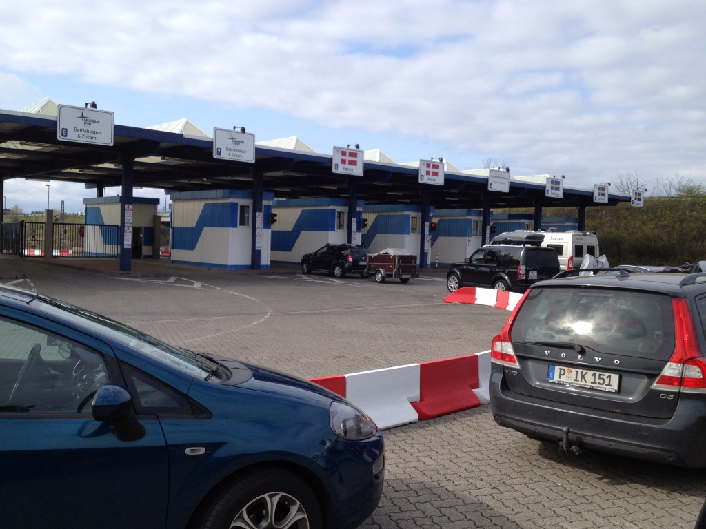 Ein Blick auf unsere gerade erhaltene Bordkarte offenbart, dass wir uns als einziges Auto (von Hunderten) in die Schlange nach Trelleborg stellen sollen, zumindest hängt über der angegebenen Reihe ein Schild mit dem Aufschrift Trelleborg. Wir werden erstmal stutzig und stellen uns entgegen der Anweisung auf unserer Bordkarte einfach mal in die Schlange nach Rønne. Ich steige aus und frage mich mal ein wenig durch ob noch jemand nach Rønne will, aber „vom Automaten“ nach Trelleborg geschickt wurde. Die Leute prüfen alle noch mal ihre Papiere, aber sie wollen alle nach Rønne und werden auch von dem System so auf die Wartereihen verteilt, dass überall das Schild „Rønne“ drüber hängt. Komisch.